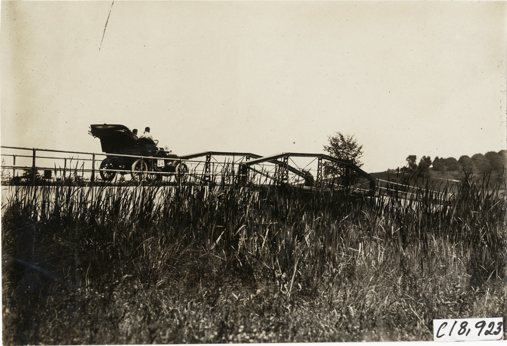 View of C.W. Kelsey and passenger in Maxwell car no. 24 crossing a bridge during the 1906 Glidden Tour. Handwritten on back: "#24, 36 h.p. Maxwell, C.W. Kelsey. Tours--Glidden Tour, 1906."