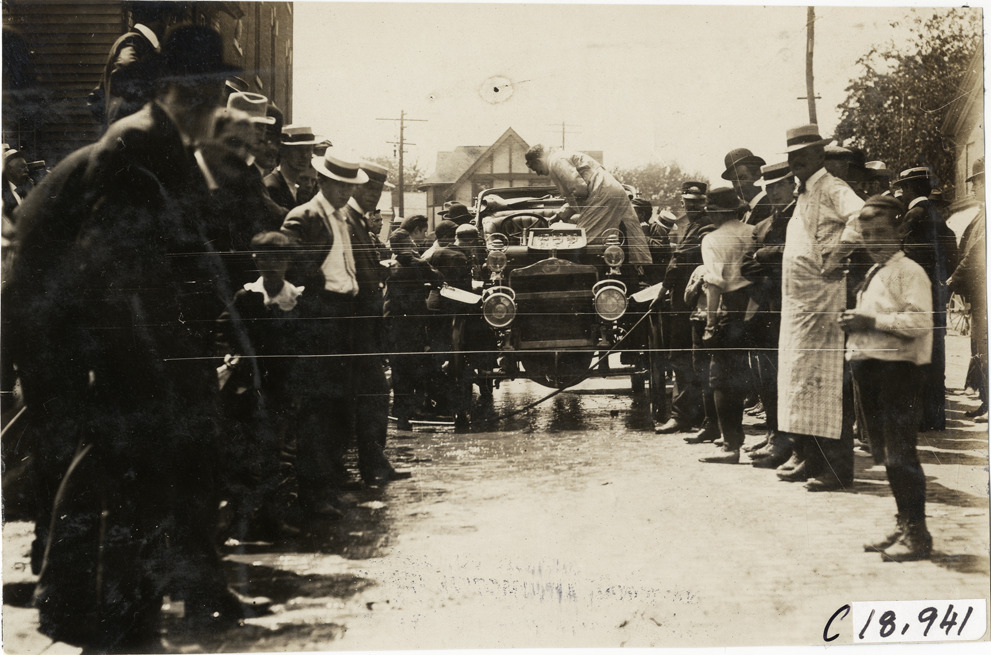Favorite this☆ Motorist standing in automobile, 1906 Glidden Tour Description: Front view of driver standing in front seat of car, surrounded by spectators, during the 1906 Glidden Tour. Handwritten on back: "Tours--Glidden Tour, 1906." Details Resource ID: na021515 Subject: Automobiles Glidden Tour (1906) Automobile driving--Competitions Photographic prints Date Issued: 1906-07 Format: 1 photographic print ; 4.5 x 6.75 in. Member of: National Automotive History Collection Lazarnick Collection Filing Location: Tours--Glidden Tour, 1906 #13 Negative Number: Negative #C18,941 Rights: Physical rights are retained by DPL. Copyright is retained in accordance with U.S. copyright laws.