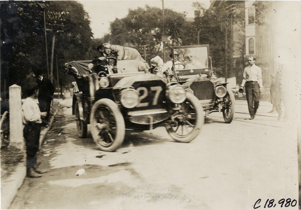 View of Percy Pierce and passenger in Pierce-Arrow car no. 27 during the 1906 Glidden Tour. Handwritten on back: "#27, 40-45 h.p. Pierce, Percy P. Pierce. Tours--Glidden Tour, 1906."