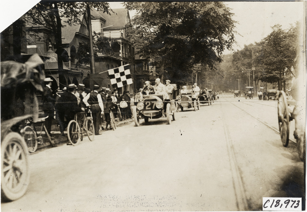 View of Percy Pierce and passengers in Pierce-Arrow car no. 27 during the 1906 Glidden Tour. Spectators watch from sidewalk; checkered flag in foreground. Handwritten on back: "#27, 40-45 h.p. Pierce, Percy P. Pierce. Tours--Glidden Tour, 1906."
