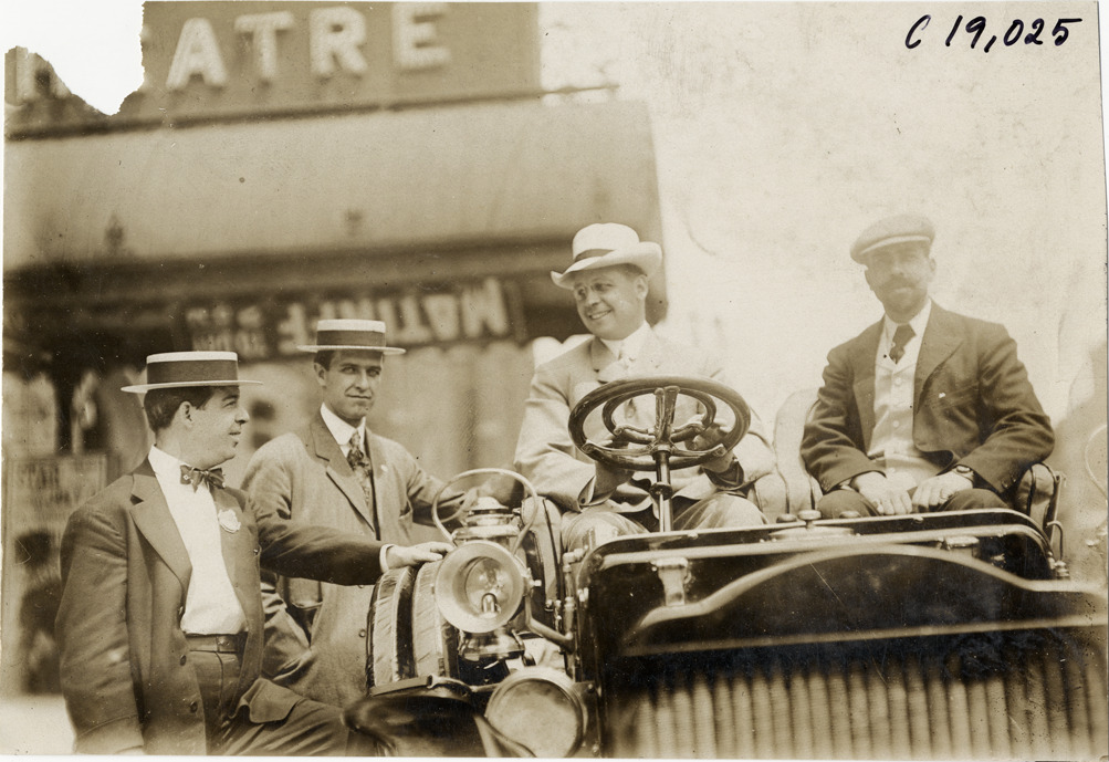 Close-up view of Augustus Post and passenger in White Steamer car no. 31 at Buffalo, New York, parked in front of the Teck Theatre, during the 1906 Glidden Tour. Two men stand next to car. Handwritten on back: "#31, 18 h.p. White, Augustus Post. Tours--Glidden Tour, 1906."