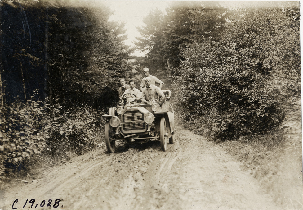 Charles Schmidt and passengers in Peerless automobile traveling on rural road, 1906 Glidden Tour