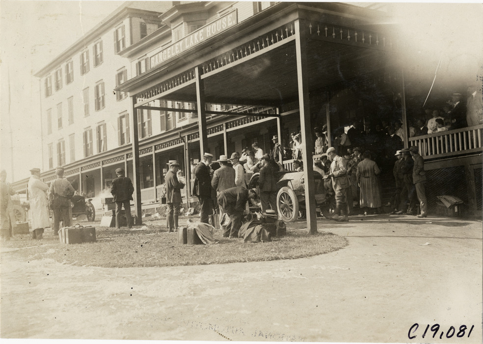 View of motorists and car in front of the Rangeley Lake House in Rangeley, Maine during the 1906 Glidden Tour. "Rangeley Lake House" sign over entrance. Handwritten on back: "Tours--Glidden Tour, 1906."