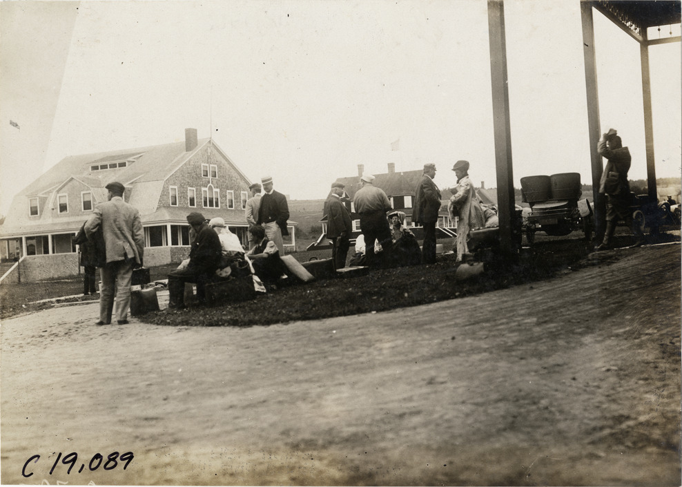 View of motorists relaxing in front of the Rangeley Lake House in Rangeley, Maine during the 1906 Glidden Tour. Shingle style house in background. Handwritten on back: "Tours--Glidden Tour, 1906."