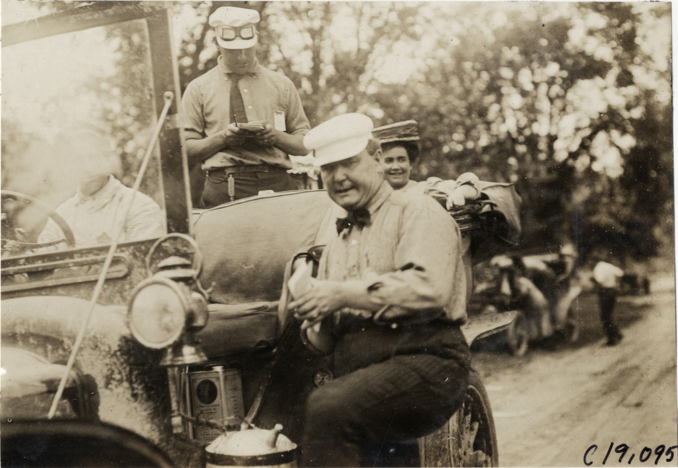 Favorite this☆ Motorists with automobile, 1906 Glidden Tour Description: Close-up view of driver and passengers with car during the 1906 Glidden Tour. Man on left holds an inner tube. Handwritten on back: "Tours--Glidden Tour, 1906." Details Resource ID: na021669 Subject: Automobiles Glidden Tour (1906) Automobile driving--Competitions Photographic prints Date Issued: 1906-07 Format: 1 photographic print ; 4.5 x 6.5 in. Member of: National Automotive History Collection Lazarnick Collection Filing Location: Tours--Glidden Tour, 1906 #16 Negative Number: Negative #C19,095 Rights: Physical rights are retained by DPL. Copyright is retained in accordance with U.S. copyright laws.