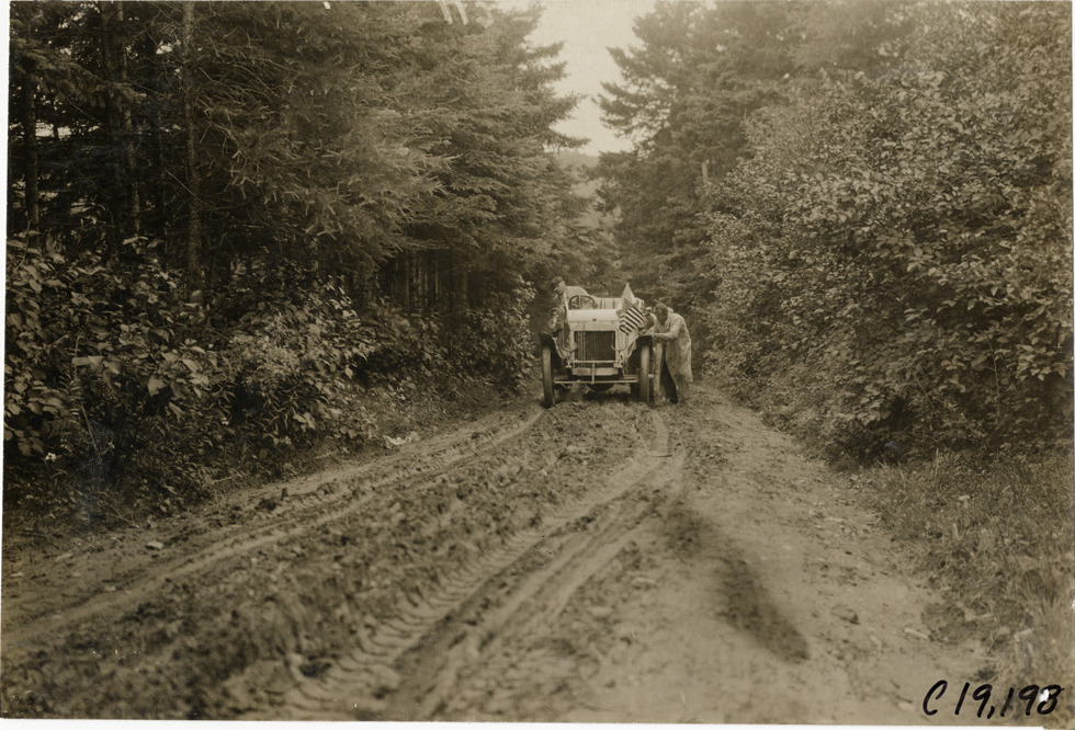 View of motorists pushing Daimler car uphill on rural dirt road during the 1906 Glidden Tour. Stamped on back: "Photo by N. Lazarnick, 29 West 42nd Street, New York." Handwritten on back: "The English Daimler being pushed up a hill. Tours--Glidden Tour, 1906."