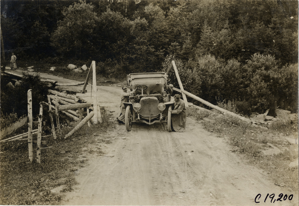 View of motorists pushing Lozier car across rustic wooden bridge near St. Joseph, Quebec during the 1906 Glidden Tour. Stamped on back: "Photo by N. Lazarnick, 29 West 42nd Street, New York." Handwritten on back: "The Lozier car being pushed up a steep hill near St. Joseph. Tours--Glidden Tour, 1906."