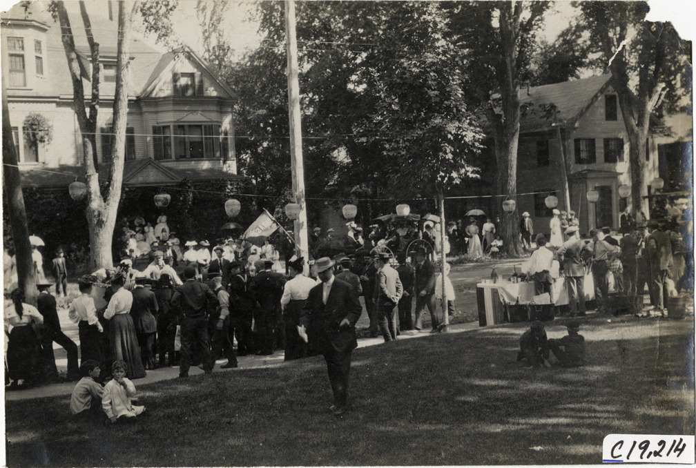 View of spectators gathered on roadside in front of hotel during the 1906 Glidden Tour. Men stand behind refreshment table on right; paper lanterns are displayed along sidewalk. Houses in background. Handwritten on back: "Tours--Glidden Tour, 1906."