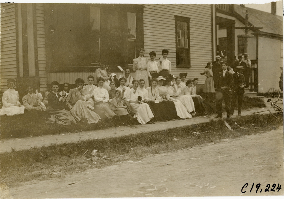 View of group of women and girls on roadside at Bretton Woods, New Hampshire during the 1906 Glidden Tour. Handwritten on back: "Girls greeting the tourists to Bretton Woods. Tours--Glidden Tour, 1906."
