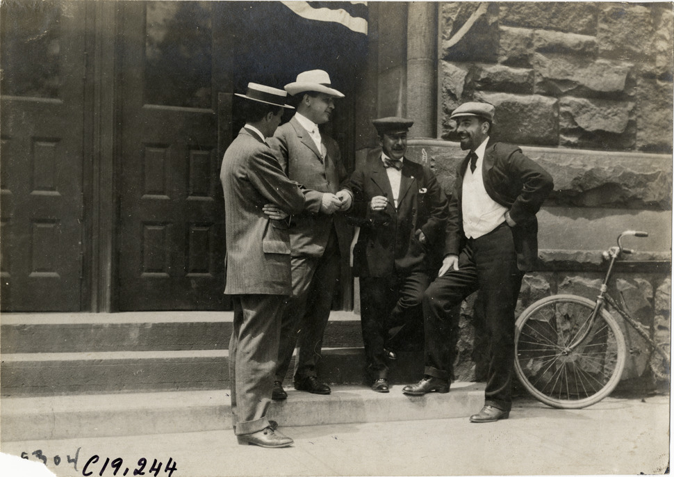 View of Augustus Post, Sidney Gorham, Paul H. Deming and F.B Hower conversing on building steps during the 1906 Glidden Tour. Handwritten on back: "Mr. Post, Mr. Gorham, Mr. Deming, Mr. Hower. Tours--Glidden Tour, 1906."