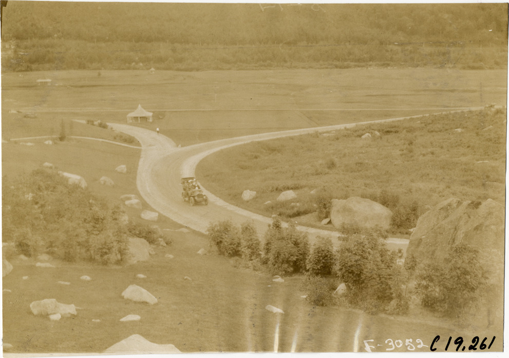 Bird's-eye view of car traveling on road near the Mount Washington Hotel at Bretton Woods, New Hampshire during the 1906 Glidden Tour. Handwritten on back: "Tours--Glidden Tour, 1906."