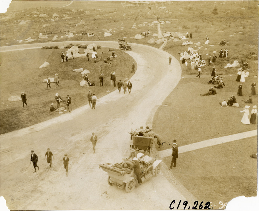 Automobiles and spectators near Mount Washington Hotel, 1906 Glidden Tour