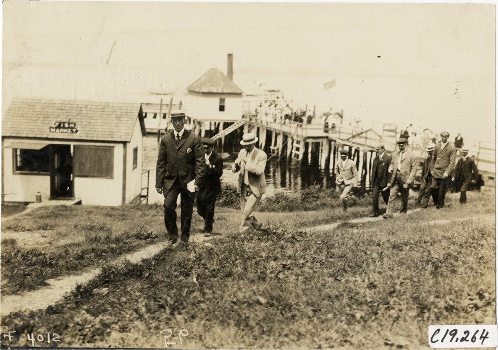 View of men leaving dock along shoreline during the 1906 Glidden Tour. Wooden-frame building with "Fish market" sign in background. Handwritten on back: "Tours--Glidden Tour, 1906."