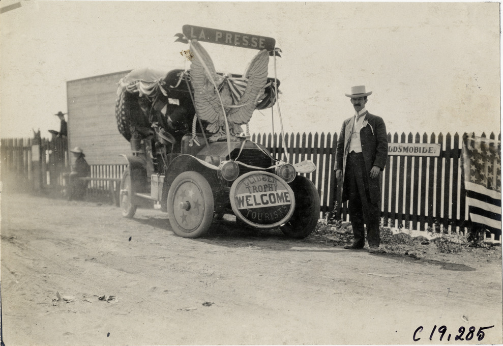 Favorite this☆ Man posing with decorated car, 1906 Glidden Tour Description: View of man posing with decorated car during the 1906 Glidden Tour. Car is decorated with ribbons, eagle sculpture, "La Presse" sign and "Welcome Glidden tourists" sign. Handwritten on back: "N. Lazarnick. Tours--Glidden Tour, 1906." Details Resource ID: na021842 Subject: Automobiles--Decoration Glidden Tour (1906) Automobile driving--Competitions Photographic prints Date Issued: 1906-07 Format: 1 photographic print ; 4.5 x 6.75 in. Member of: National Automotive History Collection Lazarnick Collection Filing Location: Tours--Glidden Tour, 1906 #27 Negative Number: Negative #C19,285 Rights: Physical rights are retained by DPL. Copyright is retained in accordance with U.S. copyright laws.
