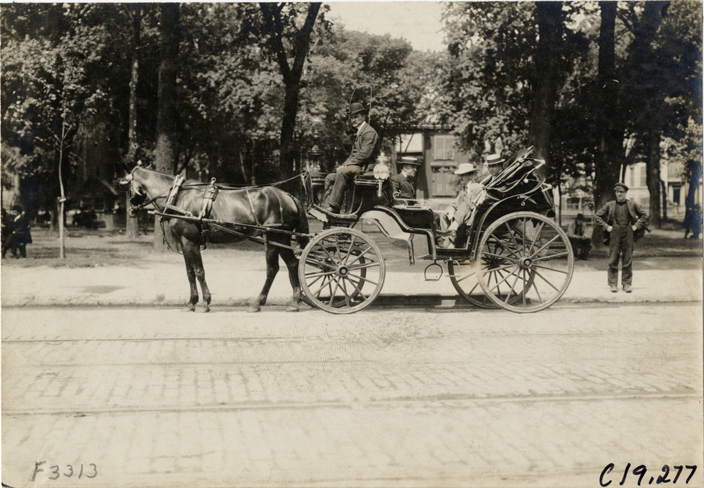 View of driver and passengers in a horse-drawn carriage during the 1906 Glidden Tour. Stamped on back: "Photo by N. Lazarnick, 29 West 42nd Street, New York." Handwritten on back: "Tours--Glidden Tour, 1906."