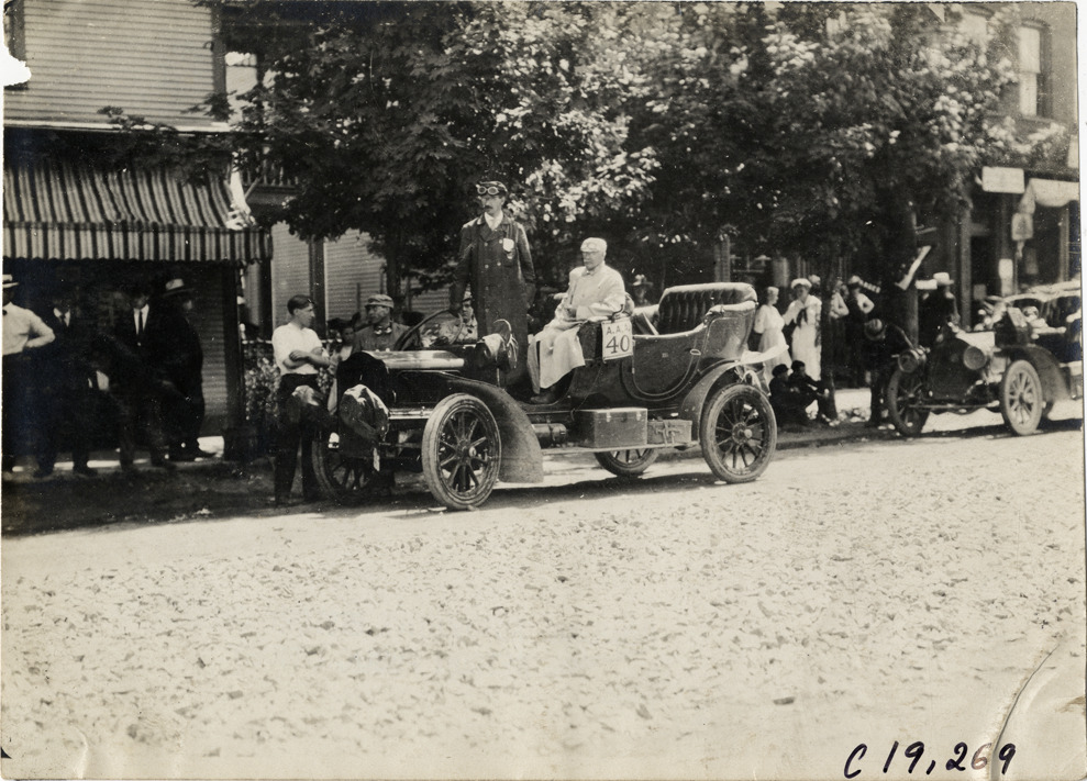 Favorite this☆ Driver and passenger in automobile, 1906 Glidden Tour Description: View of driver and passenger in car no. 40 during the 1906 Glidden Tour. Spectators and commercial buildings in background. Handwritten on back: "Tours--Glidden Tour, 1906." Details Resource ID: na021858 Subject: Automobiles Glidden Tour (1906) Automobile driving--Competitions Photographic prints Date Issued: 1906-07 Format: 1 photographic print ; 4.75 x 6.5 in. Member of: National Automotive History Collection Lazarnick Collection Filing Location: Tours--Glidden Tour, 1906 #27 Negative Number: Negative #C19,269 Rights: Physical rights are retained by DPL. Copyright is retained in accordance with U.S. copyright laws.