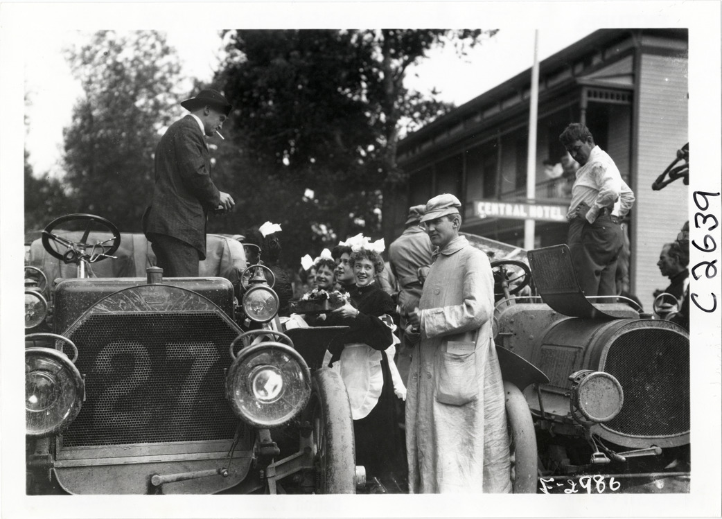 View of Percy Pierce standing in front seat of Pierce-Arrow car no. 27 during the 1906 Glidden Tour. Man wearing driving clothes and group of women wearing nurse's uniforms stand next to car. Central Hotel in background. Handwritten on back: "#27 Pierce, 40-45 h.p., entrant Percy P. Pierce. Tours--Glidden Tour, 1906."