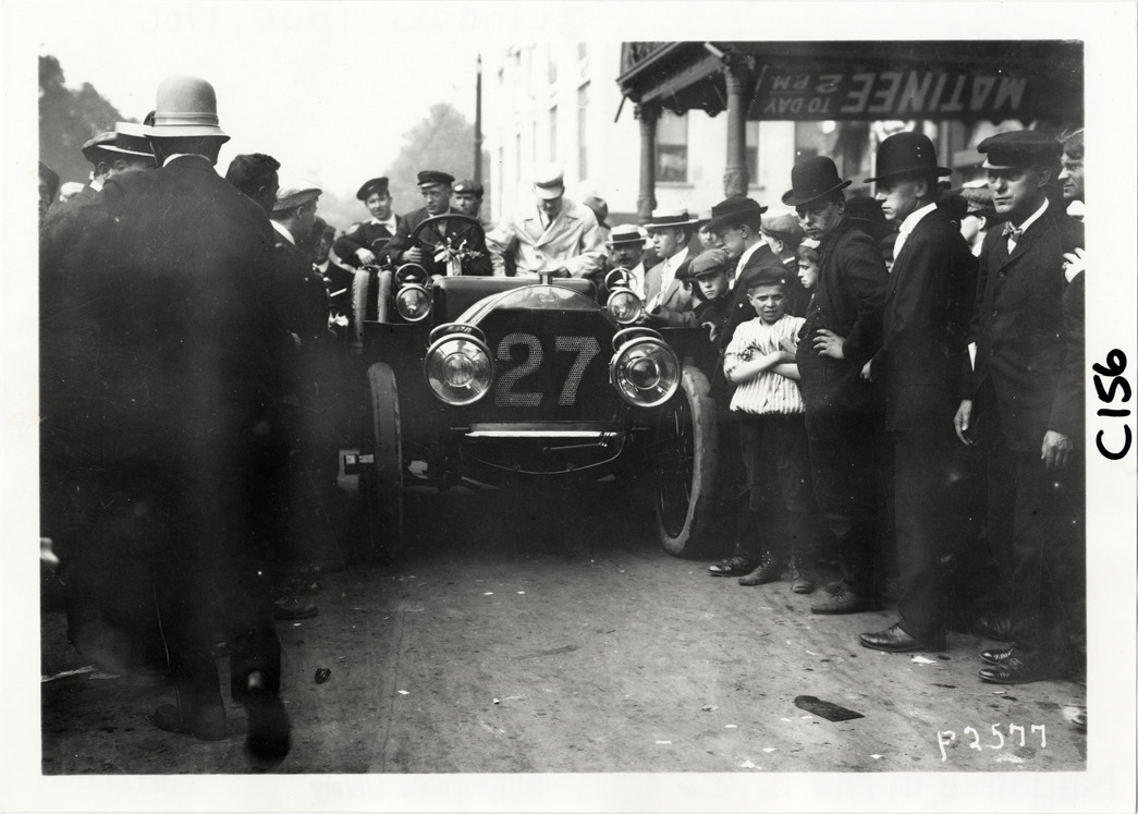 Front view of Percy Pierce and passengers in Pierce-Arrow car no. 27, surrounded by spectators, during the 1906 Glidden Tour. Handwritten on back: "#27 Pierce, 40-45 h.p., entrant Percy P. Pierce. Tours--Glidden Tour, 1906."