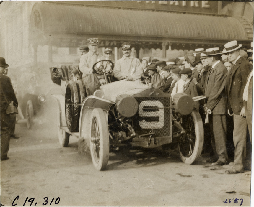 View of George M. Davis and passengers in Thomas car no. 9 in front of the Teck Theatre in Buffalo, New York during the 1906 Glidden Tour. Spectators stand on sidewalk. Handwritten on back: "Geo. M. Davis in a 50 h.p. Thomas. Tours--Glidden Tour, 1906."