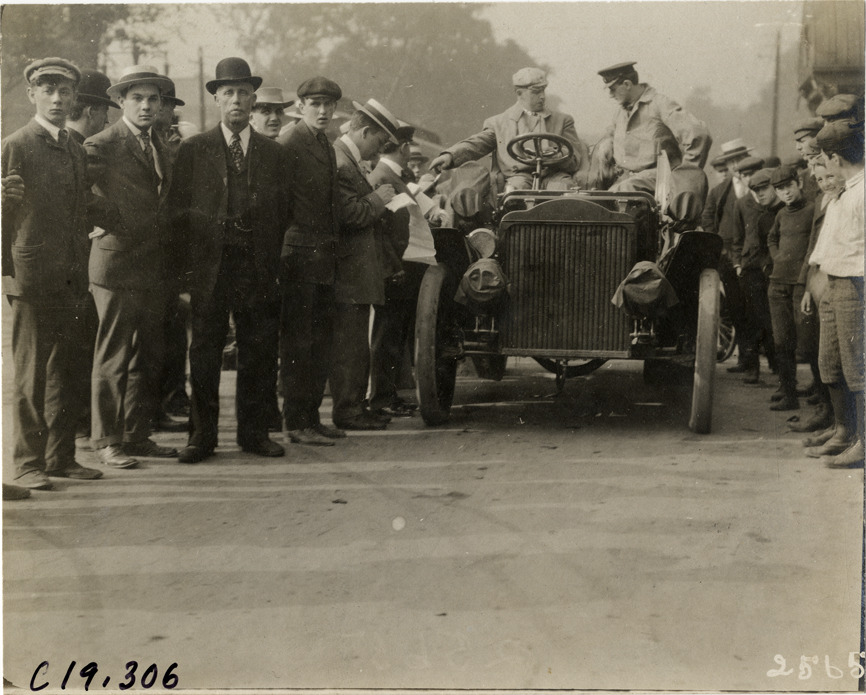 Front view of driver and passengers in White Steamer car, surrounded by spectators, in front of the Teck Theatre in Buffalo, New York during the 1906 Glidden Tour. Stamped on back: "Photo by N. Lazarnick, 29 West 42nd Street, New York." Handwritten on back: "White starting. Tours--Glidden Tour, 1906."
