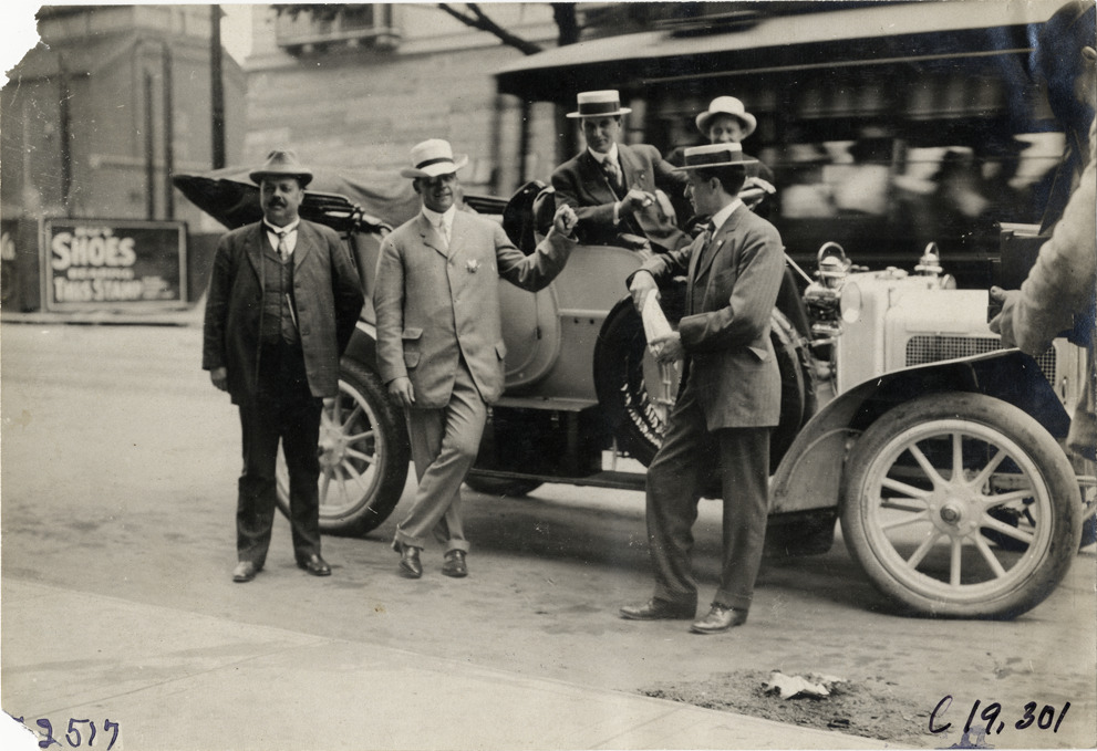 View of Charles Glidden, Paul H. Deming, Sidney Gorham and Webb Jay with car during the 1906 Glidden Tour. Stamped on back: "Photo by N. Lazarnick, 29 West 42nd Street, New York." Handwritten on back: "Mr. Glidden, Mr. Gorham, Mr. Paul Demming [sic], Webb Jay at the wheel. Tours--Glidden Tour, 1906."