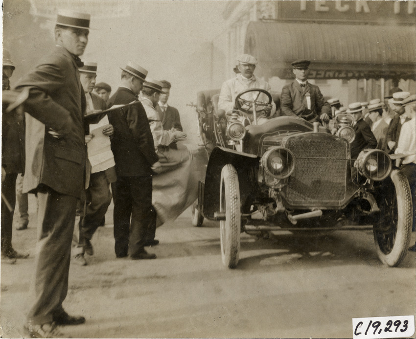 View of driver and passengers in Thomas car in front of the Teck Theatre in Buffalo, New York, surrounded by spectators, during the 1906 Glidden Tour. Stamped on back: "Photo by N. Lazarnick, 29 West 42nd Street, New York." Handwritten on back: "Thomas car. Tours--Glidden Tour, 1906."