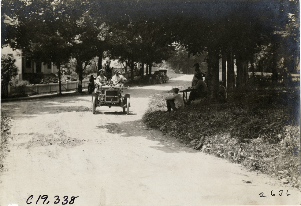 View of driver and passengers in Maxwell car traveling on tree-lined residential street in Glenville, New York during the 1906 Glidden Tour. Stamped on back: "Photo by N. Lazarnick, 29 West 42nd Street, New York." Handwritten on back: "Checking station at Glenville, Maxwell car. Tours--Glidden Tour, 1906."