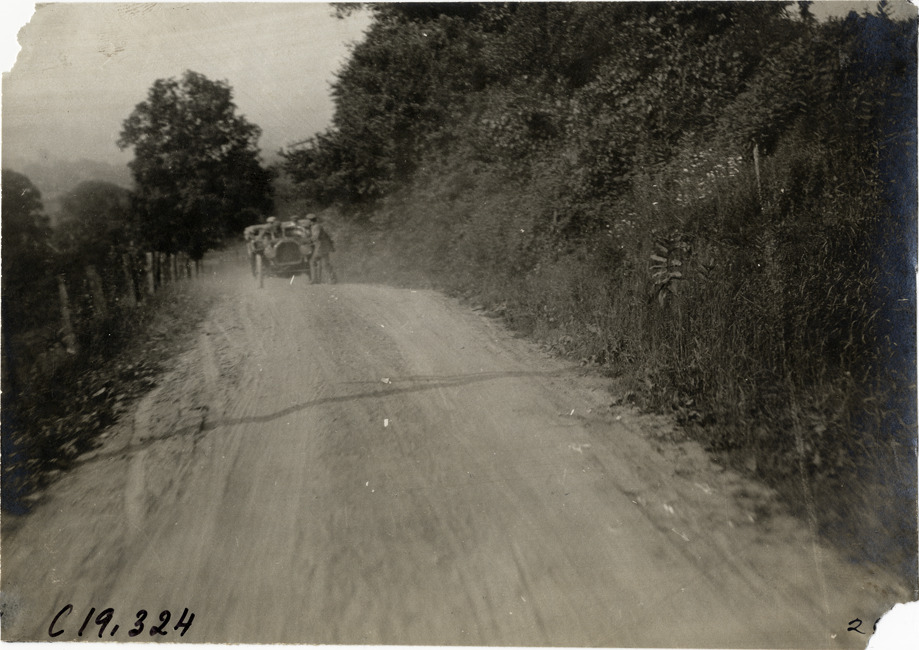 View of motorists in Apperson car traveling on rural road near Little Falls, New York during the 1906 Glidden Tour. Stamped on back: "Photo by N. Lazarnick, 29 West 42nd Street, New York." Handwritten on back: "Nearing Little Falls, Apperson car. Tours--Glidden Tour, 1906."