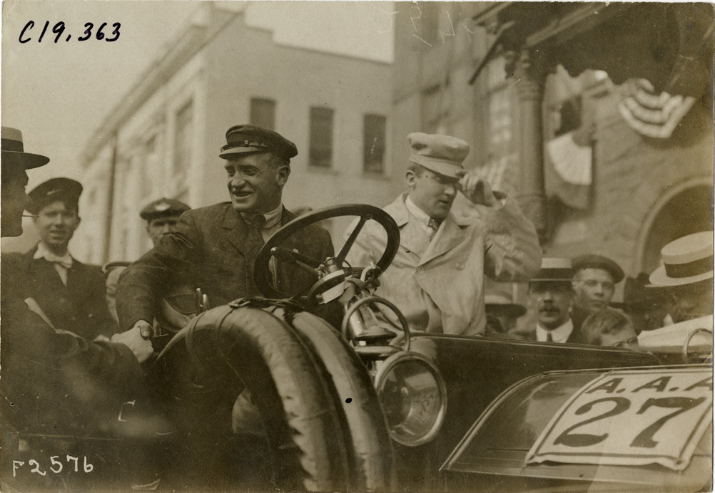 Close-up view of driver and passenger in car no. 27 during the 1906 Glidden Tour. Stamped on back: "Photo by N. Lazarnick, 29 West 42nd Street, New York." Handwritten on back: "Tours--Glidden Tour, 1906."
