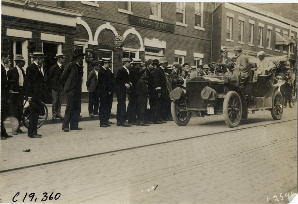 Spectators looking at motorists in automobile in front of Hotel Savoy, 1906 Glidden Tour