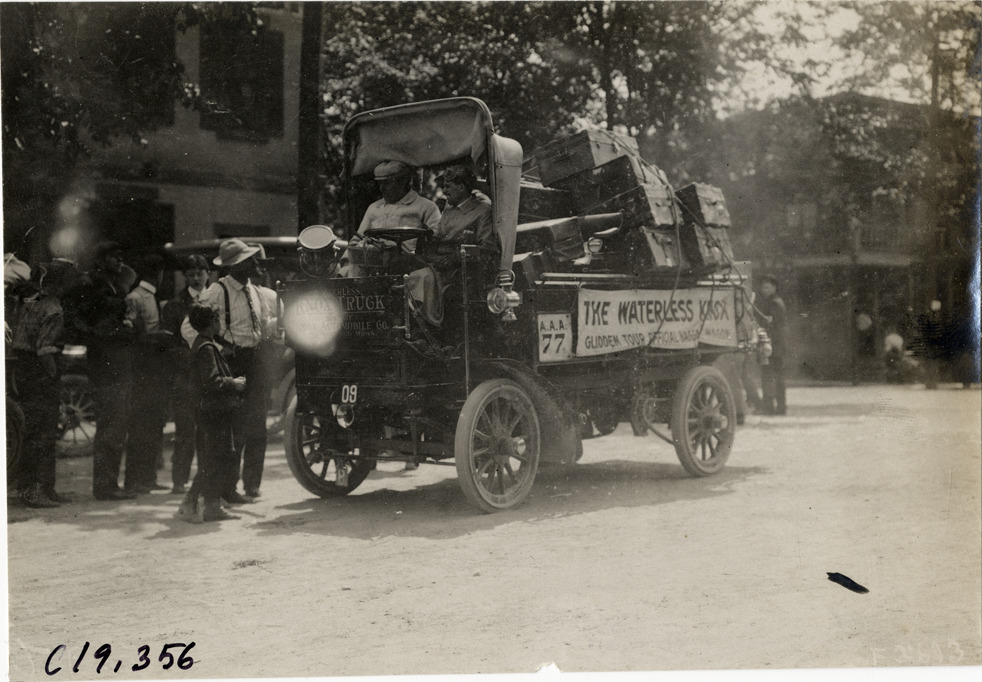 View of driver and passenger in Knox truck loaded with luggage during the 1906 Glidden Tour. Signs on truck read: "The waterless Knox, Glidden Tour official baggage wagon, A.A.A. 77." Spectators stand on left. Stamped on back: "Photo by N. Lazarnick, 29 West 42nd Street, New York." Handwritten on back: "Tours--Glidden Tour, 1906."