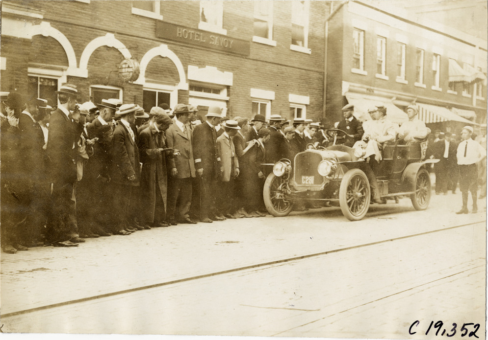 Favorite this☆ Spectators looking at motorists in automobile in front of Hotel Savoy, 1906 Glidden Tour Description: View of spectators looking at motorists in car in front of Hotel Savoy during the 1906 Glidden Tour. Handwritten on back: "Tours--Glidden Tour, 1906." Details Resource ID: na021933 Subject: Automobiles Spectators Hotels Glidden Tour (1906) Automobile driving--Competitions Photographic prints Date Issued: 1906-07 Format: 1 photographic print ; 4.5 x 6.75 in. Member of: National Automotive History Collection Lazarnick Collection Filing Location: Tours--Glidden Tour, 1906 #30 Negative Number: Negative #C19,352 Rights: Physical rights are retained by DPL. Copyright is retained in accordance with U.S. copyright laws.