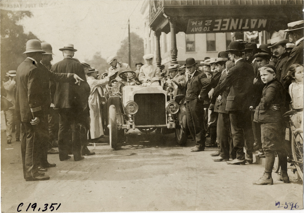 View of Webb Jay and passengers in White Steamer car in front of the Teck Theatre, surrounded by spectators, in Buffalo, New York during the 1906 Glidden Tour. Stamped on back: "Photo by N. Lazarnick, 29 West 42nd Street, New York." Handwritten on back: "Webb Jay in White. Tours--Glidden Tour, 1906."