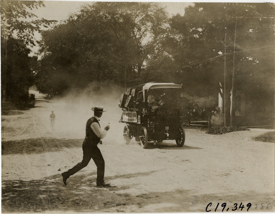 View of driver and passenger in Knox truck loaded with luggage during the 1906 Glidden Tour. Signs on truck read: "The waterless Knox, Glidden Tour official baggage wagon, A.A.A. 77." Man runs toward truck in foreground. Stamped on back: "Photo by N. Lazarnick, 29 West 42nd Street, New York." Handwritten on back: "Knox truck baggage wagon. Tours--Glidden Tour, 1906."