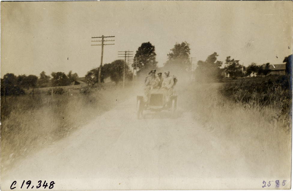 View of motorists in Buick car traveling on rural road during the 1906 Glidden Tour. Stamped on back: "Photo by N. Lazarnick, 29 West 42nd Street, New York." Handwritten on back: "Buick on the road to [undecipherable]. Tours--Glidden Tour, 1906."