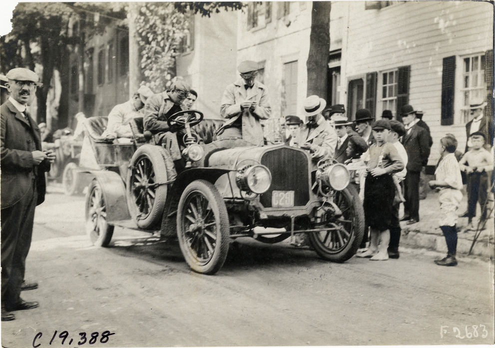 View of driver and passengers in car at Saratoga, New York during the 1906 Glidden Tour. Spectators stand on sidewalk. Stamped on back: "Photo by N. Lazarnick, 29 West 42nd Street, New York." Handwritten on back: "Tours--Glidden Tour, 1906."