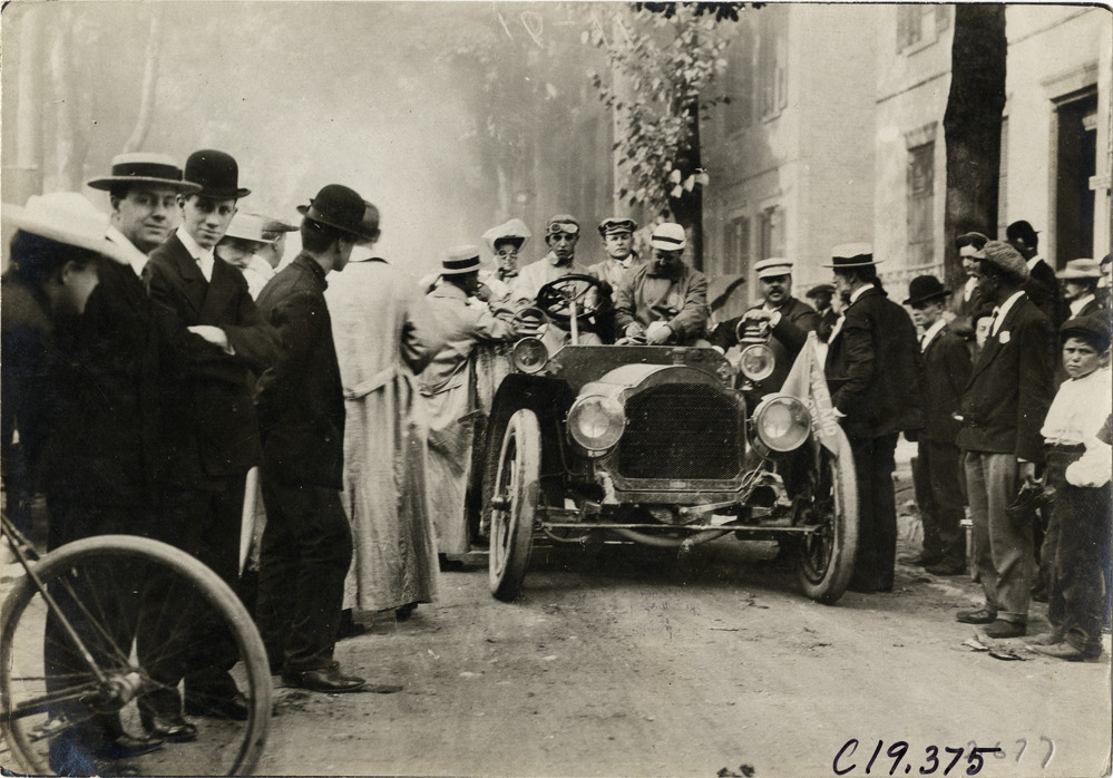 Front view of driver and passengers in car at Saratoga, New York, surrounded by spectators, during the 1906 Glidden Tour. Stamped on back: "Photo by N. Lazarnick, 29 West 42nd Street, New York." Handwritten on back: "Tours--Glidden Tour, 1906."