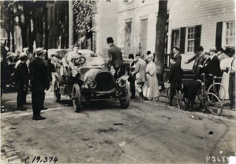 Front view of driver and passengers in car at Saratoga, New York, surrounded by spectators, during the 1906 Glidden Tour. Stamped on back: "Photo by N. Lazarnick, 29 West 42nd Street, New York." Handwritten on back: "Tours--Glidden Tour, 1906."