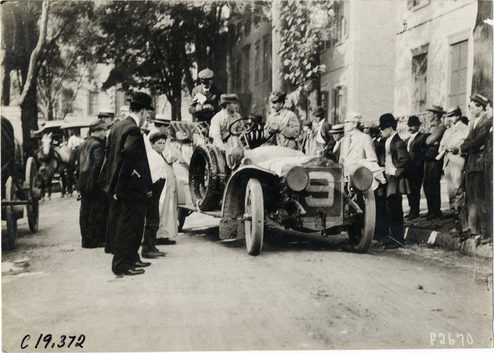 Front view of driver and passengers in car no. 9 at Saratoga, New York, surrounded by spectators, during the 1906 Glidden Tour. Stamped on back: "Photo by N. Lazarnick, 29 West 42nd Street, New York." Handwritten on back: "Tours--Glidden Tour, 1906."