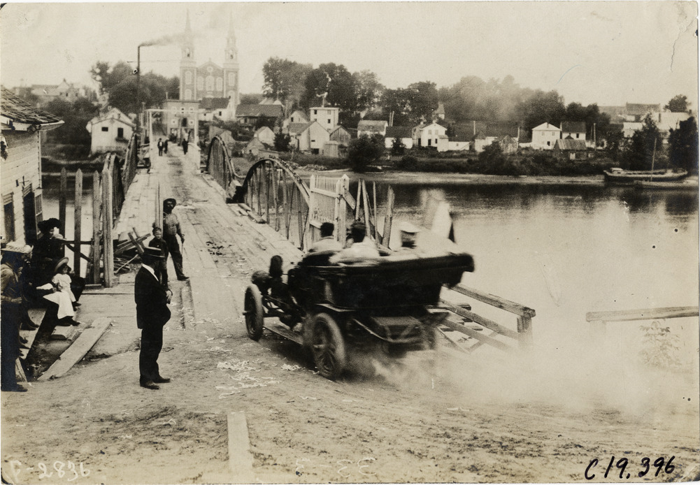 View of car approaching bridge during the 1906 Glidden Tour. Buildings and church on opposite bank of river. Stamped on back: "Photo by N. Lazarnick, 29 West 42nd Street, New York." Handwritten on back: "Tours--Glidden Tour, 1906."