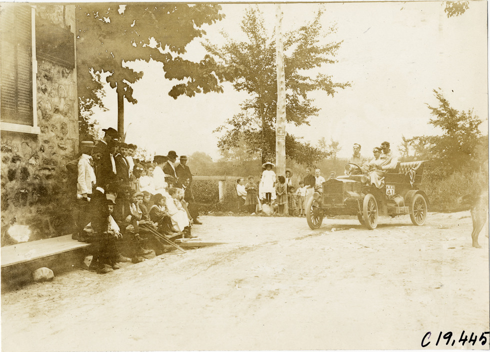 View of driver and passengers in car no. 41 during the 1906 Glidden Tour. Group of spectators gather in front of stone building; group of children in background. Stamped on back: "Photo by N. Lazarnick, 29 West 42nd Street, New York." Handwritten on back: "Tours--Glidden Tour, 1906."