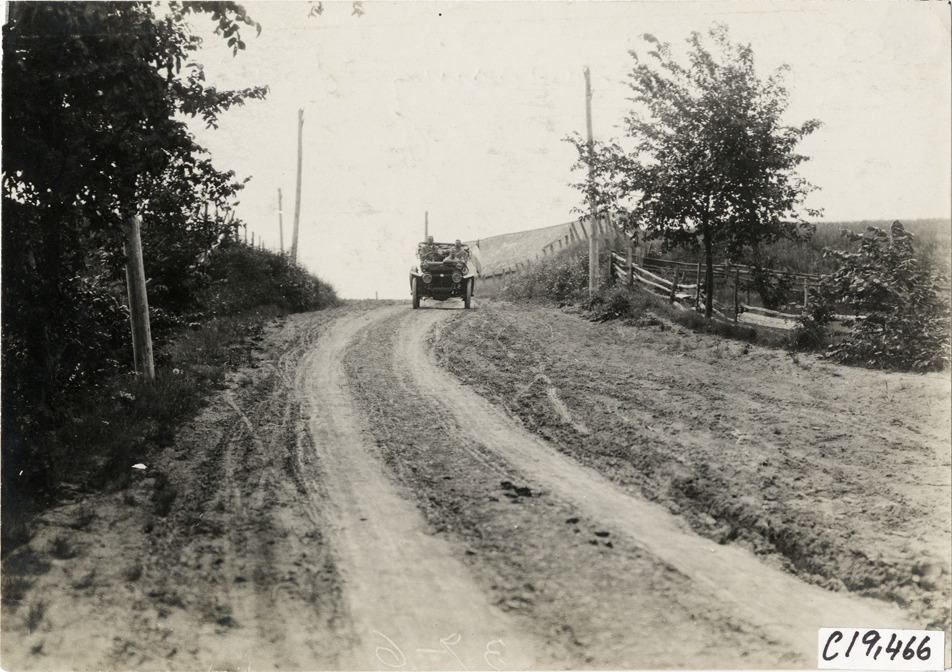 Distant view of motorists in Maxwell car traveling on rural road near Louiseville, Quebec during the 1906 Glidden Tour. Stamped on back: "Photo by N. Lazarnick, 29 West 42nd Street, New York." Handwritten on back: "Maxwell nearing Louisville [sic]. Tours--Glidden Tour, 1906."