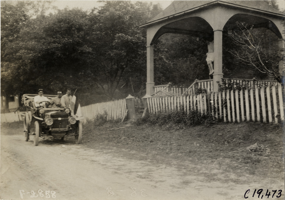 View of motorists in car passing crucifix inside roadside chapel during the 1906 Glidden Tour. Stamped on back: "Photo by N. Lazarnick, 29 West 42nd Street, New York." Handwritten on back: "Tours--Glidden Tour, 1906."