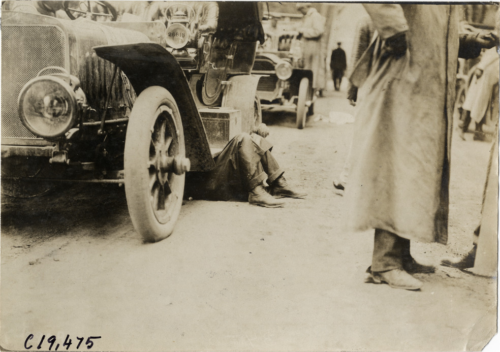 Favorite this☆ Man working under automobile, 1906 Glidden Tour Description: Close-up view of man working under car during the 1906 Glidden Tour. Stamped on back: "Photo by N. Lazarnick, 29 West 42nd Street, New York." Handwritten on back: "Tours--Glidden Tour, 1906." Details Resource ID: na022055 Creator: Lazarnick, Nathan Subject: Automobiles--Maintenance and repair Glidden Tour (1906) Automobile driving--Competitions Photographers--New York (State)--New York Photographic prints Date Issued: 1906-07 Format: 1 photographic print ; 4.75 x 6.5 in. Member of: National Automotive History Collection Lazarnick Collection Filing Location: Tours--Glidden Tour, 1906 #35 Negative Number: Negative #C19,475 Rights: Physical rights are retained by DPL. Copyright is retained in accordance with U.S. copyright laws.