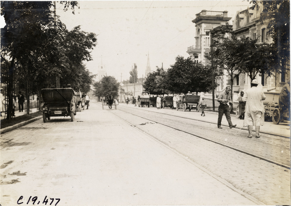 Distant view of cars lined up in tree-lined street during the 1906 Glidden Tour. Stamped on back: "Photo by N. Lazarnick, 29 West 42nd Street, New York." Handwritten on back: "Tours--Glidden Tour, 1906."
