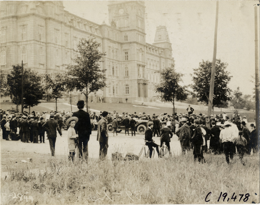 View of crowd and cars in front of Montreal, Quebec City Hall during the 1906 Glidden Tour. Stamped on back: "Photo by N. Lazarnick, 29 West 42nd Street, New York." Handwritten on back: "Tours--Glidden Tour, 1906."