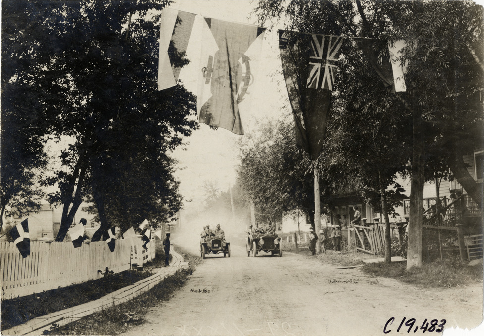 View of motorists in two cars approaching flags suspended over residential street during the 1906 Glidden Tour. Stamped on back: "Photo by N. Lazarnick, 29 West 42nd Street, New York." Handwritten on back: "Tours--Glidden Tour, 1906."