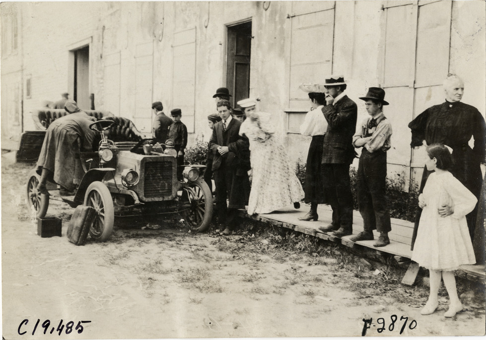 View of Reo car parked on roadside during the 1906 Glidden Tour. Spectators stand on plank sidewalk; a man leans over the side of the car. Stamped on back: "N. Lazarnick, 29 West 42nd Street, New York." Handwritten on back: "Tours--Glidden Tour, 1906."