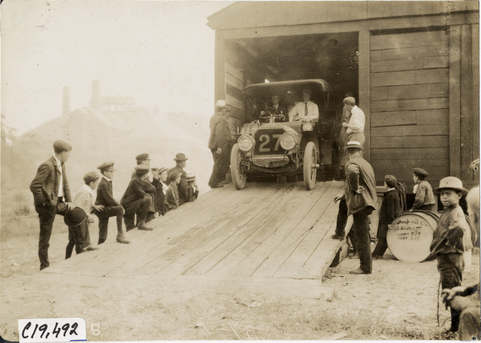 View of motorists in car no. 27 on ramp of wooden-frame garage or barn during the 1906 Glidden Tour. Group of men and boys watch from both sides of ramp. Stamped on back: "Photo by N. Lazarnick, 29 West 42nd Street, New York." Handwritten on back: "Tours--Glidden Tour, 1906."