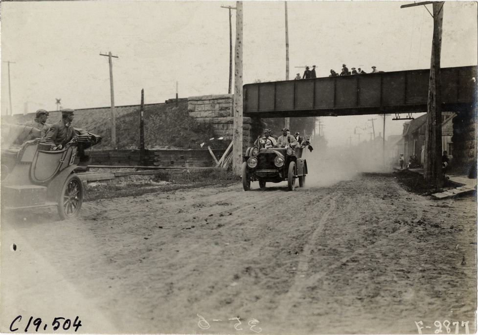 View of motorists in car passing under railroad bridge during the 1906 Glidden Tour. Stamped on back: "Photo by N. Lazarnick, 29 West 42nd Street, New York." Handwritten on back: "Tours--Glidden Tour, 1906."
